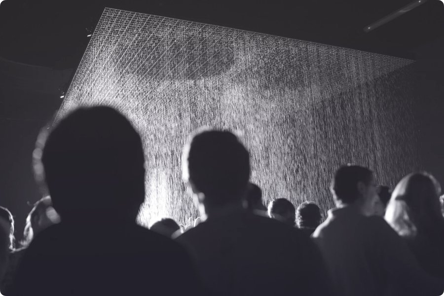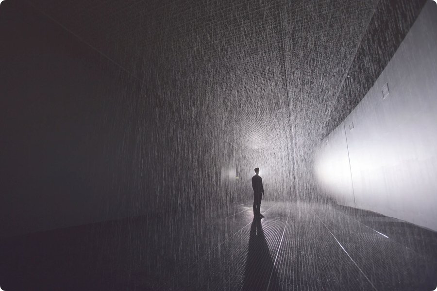 Инсталляция Random International Rain Room демонстрирует, как сцена может быть собрана через технологию. Зритель входит в комнату, где идёт дождь, но датчики «раздвигают» капли вокруг тела. Инсталляция буквально создаёт ситуацию: она делает возможным новый тип поведения — движение внутри дождя, не промокнув. Она задаёт правила сцены, ритм, границы.