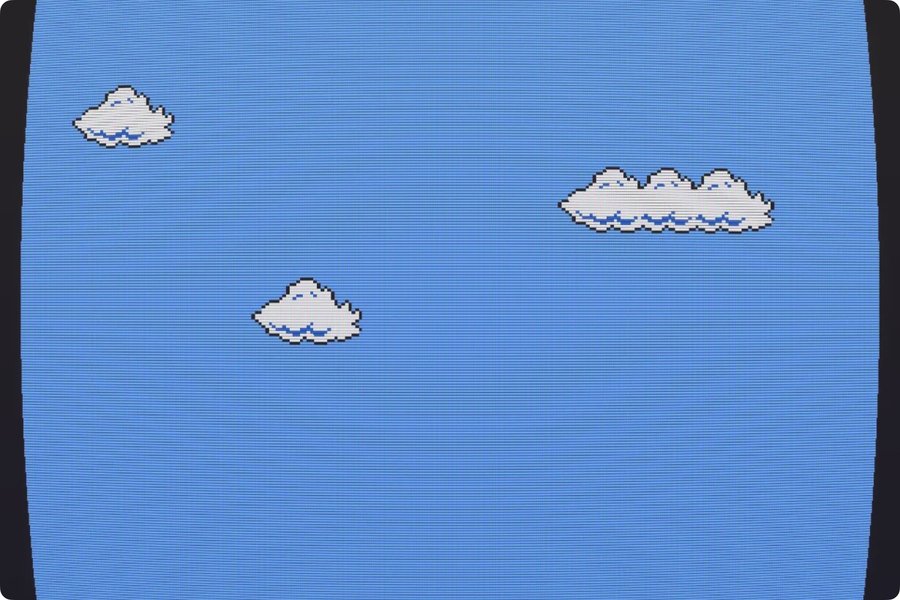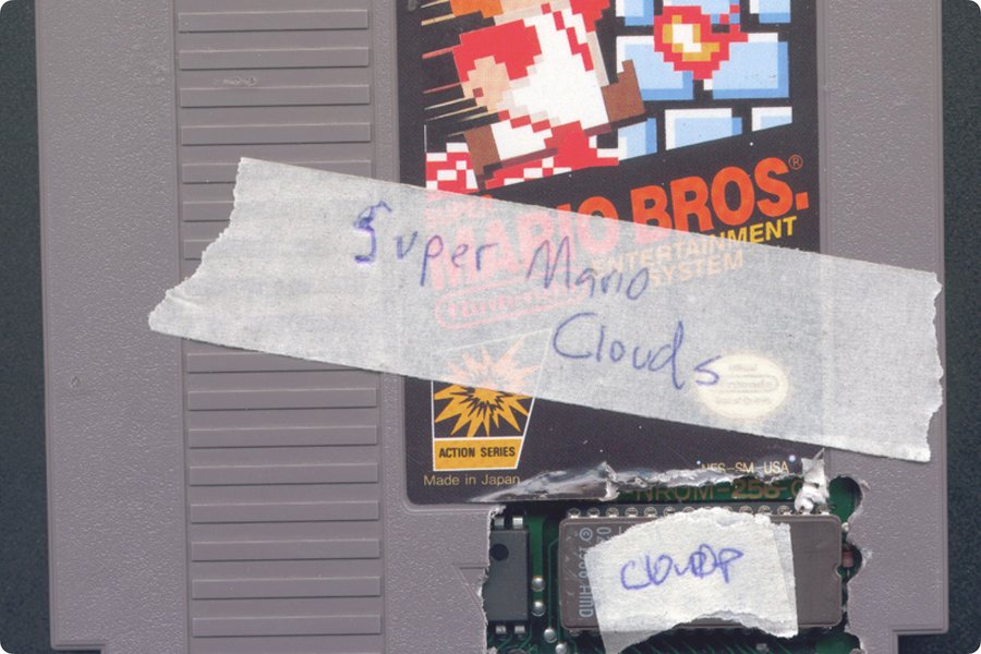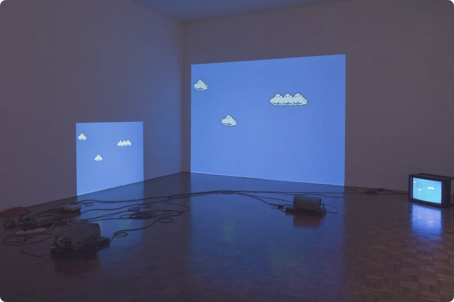 Работа Кори Арканджела Super Mario Clouds демонстрирует обратный жест: художник удаляет из игры всё, кроме фона — облаков и голубого неба. Исчезают враги, герои, сюжет, кнопки, инструкции — всё, что создаёт роль пользователя. Мы остаёмся в пространстве, где нет сценария, и именно это делает его чуждым.