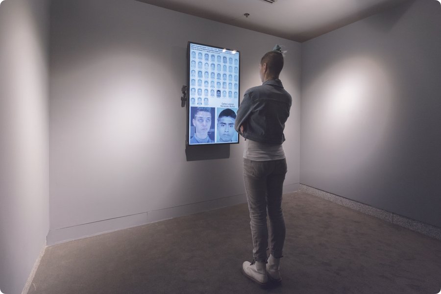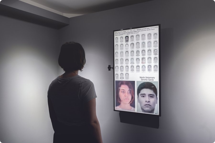 Работа Лозано-Хеммера Level of Confidence расширяет этот принцип. Система сопоставляет лицо зрителя с базой фотографий пропавших людей. Сцена собирается из камеры, алгоритмических совпадений, базы данных, ошибки распознавания, лица зрителя, архитектуры комнаты.
