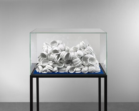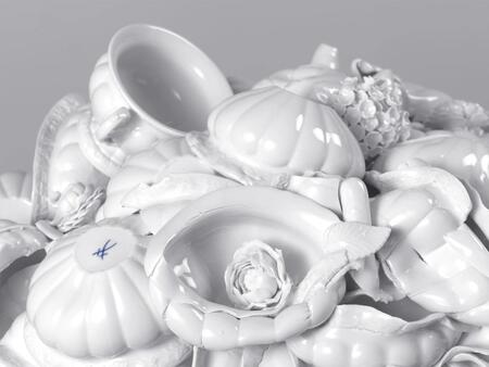 Немецкий художник Ансельм Рейле в скульптуре «Untitled, 2011 porcelain in glass display» использует разбитый фарфор из фабрики Meissen, размещённый в витринах с бархатной подкладкой, чтобы создать ауру музейных артефактов. Процесс включает сбор обломков, термическое воздействие, финальную обработку и экспозицию как драгоценностей, что выражает идею апсайкла через переосмысление отходов как искусства; фарфор здесь играет роль медиума, подчёркивающего контраст между хрупкостью и вечностью, превращая промышленные остатки в символы роскоши и критики потребления.