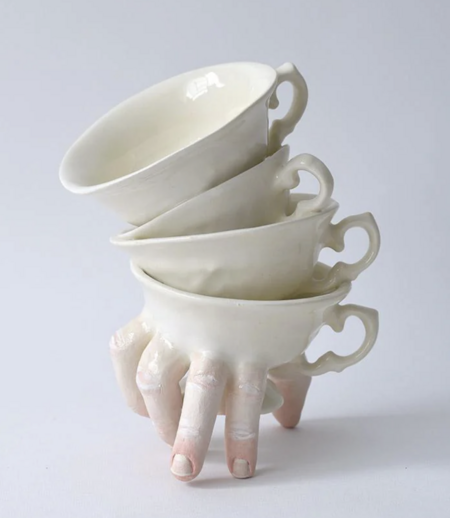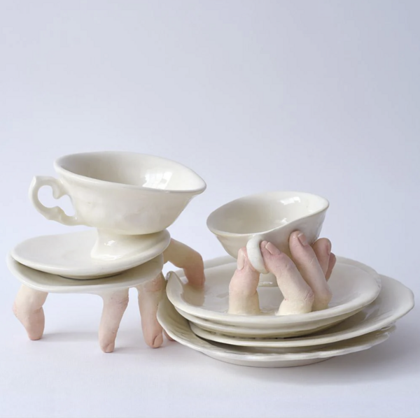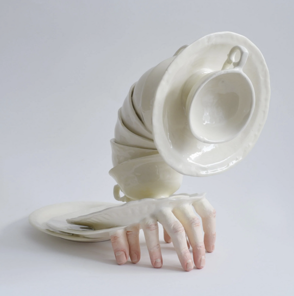 Израильская скульптор Ронит Баранга известна серией работ «Body of Work», где тарелки, чашки и чайники «оживают» с помощью человеческих частей тела — пальцев, ртов и языков, создавая эффект слияния живого и неживого. Эти гибридные объекты передают эмоции, такие как объятия или пощипывания, подчёркивая абсурдность и юмор в повседневных вещах, а также стирая границы между человеком и предметом.