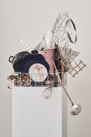 Деконструкция «женского труда»: художница Николь Вермерс использует сушилку для посуды — банальный, но узнаваемый символ домашней, часто женской работы. Художница не просто показывает этот объект, а возводит его в ранг высокого искусства, заставляя зрителя задуматься о том, почему такой труд традиционно недооценивается и остается «невидимым», превращая функциональную сушилку в пьедестал, а кухонную утварь — в объект для эстетического созерцания.