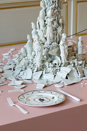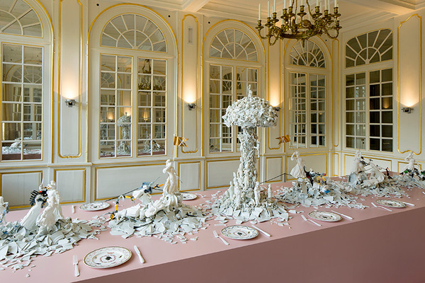 Инсталляция Буке де Вриса «War & Pieces, 2015» — это восьмиметровая композиция из разбитых фарфоровых фигур, вдохновлённая центровыми украшениями 18 века, с центральным «грибным облаком» из осколков, символизирующим войну, хаос и агрессию. Произведение сочетает юмор, красоту и сатиру.