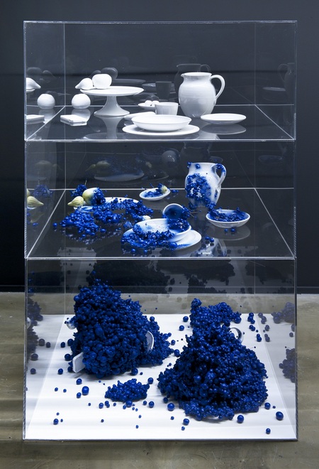 Российская художница Анна Казьмина в серии «Искусство абиогенеза» исследует процессы превращения неживой природы в живую путем разрушения и преобразования фарфоровых объектов, что символизирует переход энергии и обращение новых качеств в момент распада.