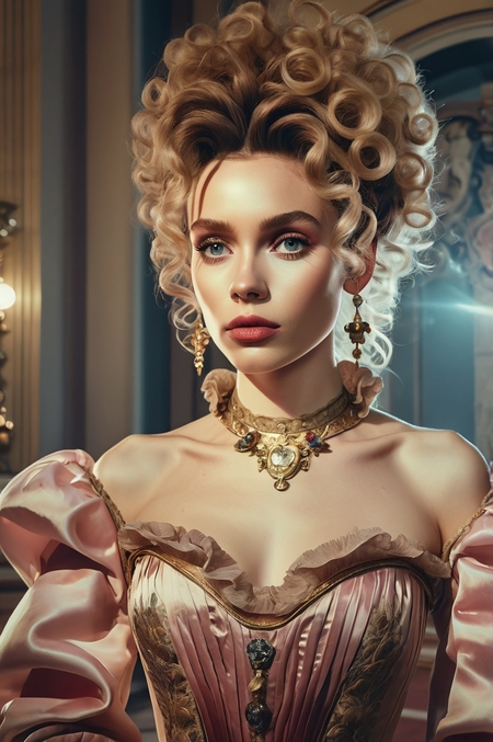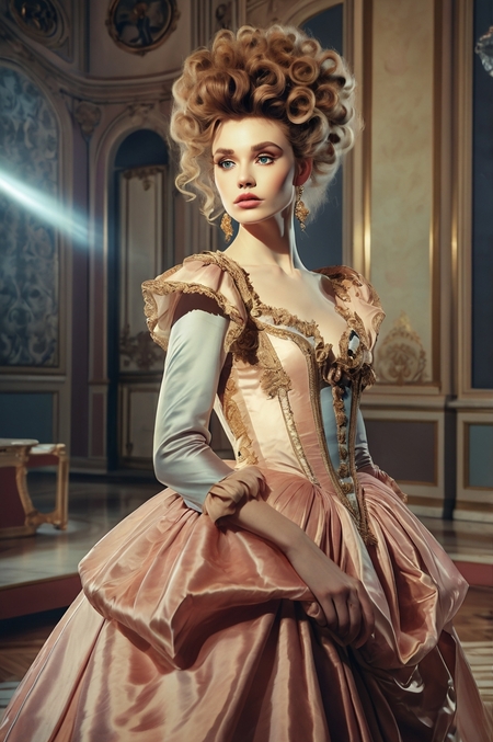 Модель: Portrait Perfect Пресет: Portrait close-up Промпт: A woman with a lush curly high hairstyle of red color. She is dressed in a pale pink volumetric dress in the Baroque or Rococo style. In the background there is a television studio in beige colors.