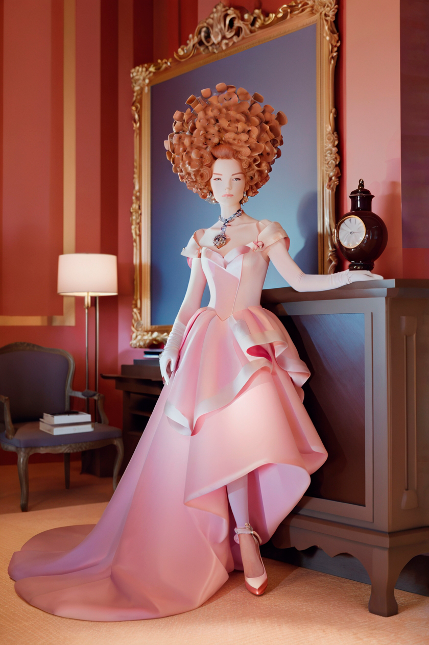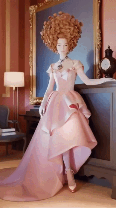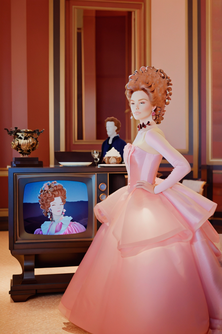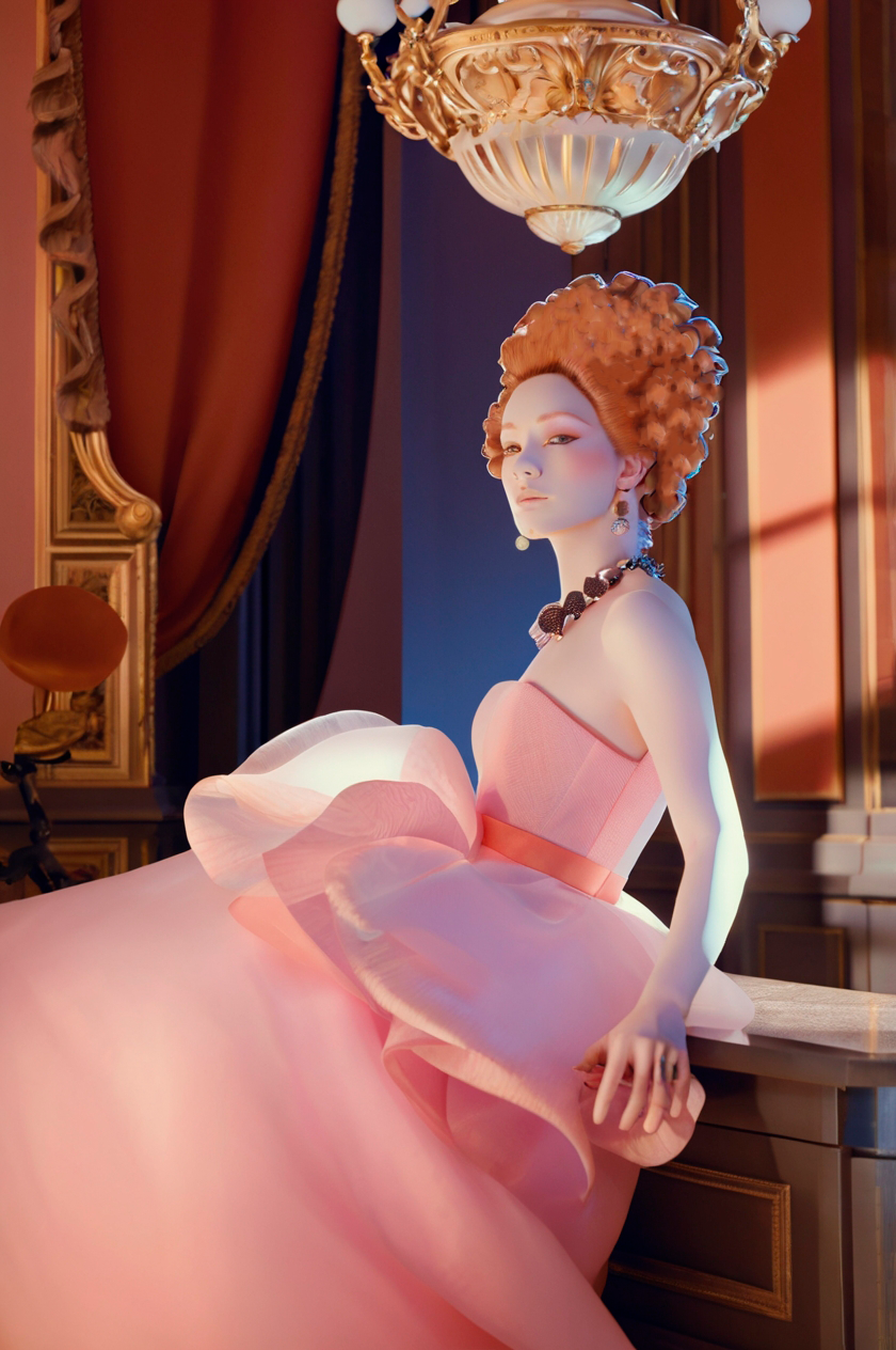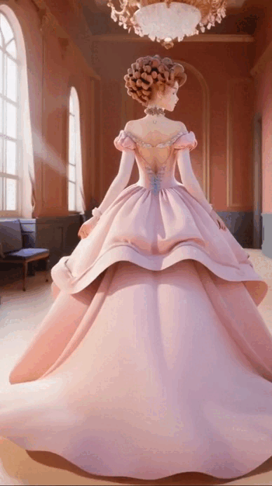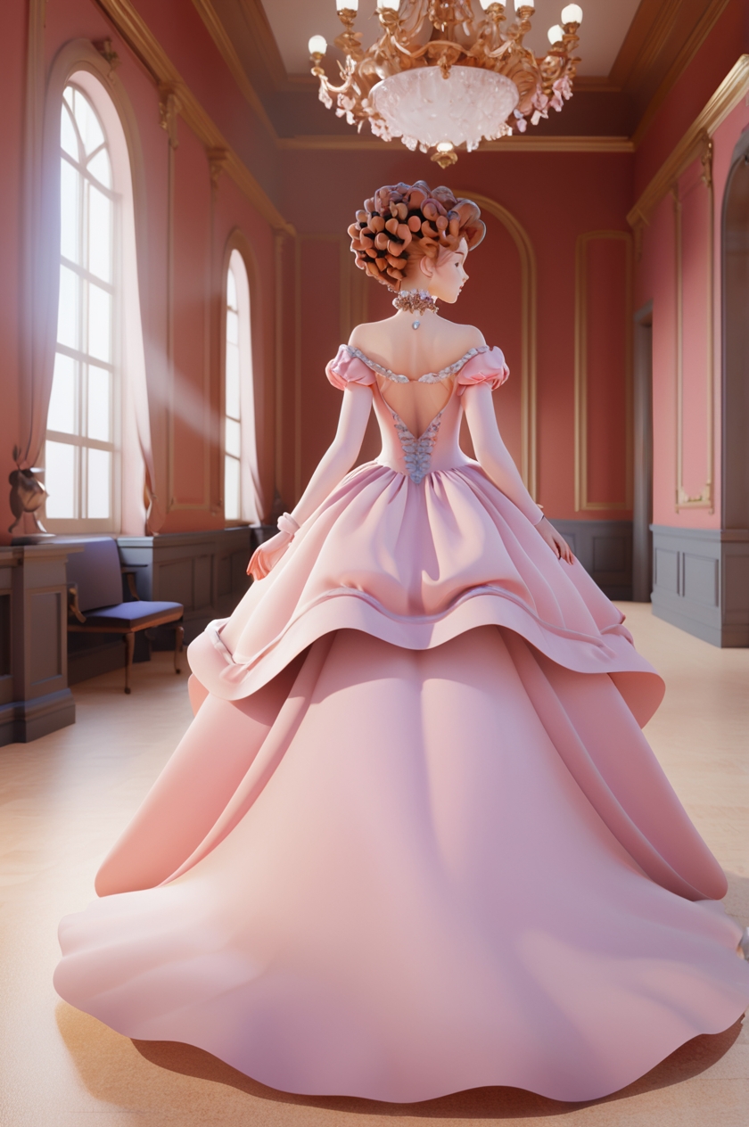 Модель: Illustrative Albedo Пресет: 3D Render Промпт: Poster for a television show. In the foreground is a woman in a lush pink dress ala Baroque or Rococo. The style is similar to plasticine or 3D.