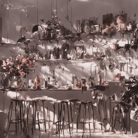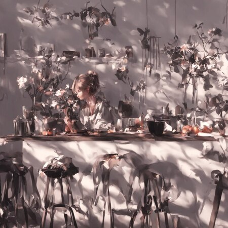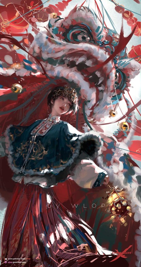 Основное внимание в творчестве WLOP уделено женским персонажам, которые изображены с изяществом и грацией. Художник подчёркивает их индивидуальность через позы, выражения лиц и окружающую обстановку. Вероятно, он использует 3D-моделирование для создания базовых сцен, которые затем дорабатывает вручную, добавляя фактурные мазки кисти и другие детали в процессе постобработки.