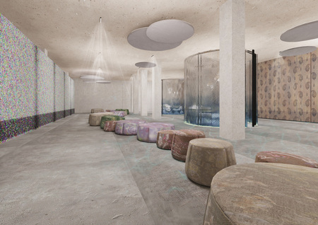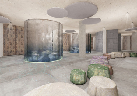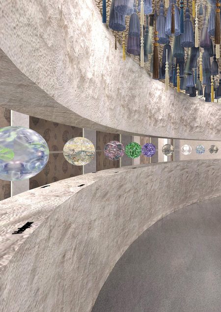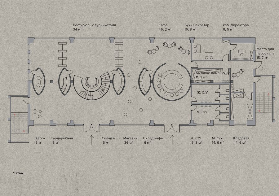 Стоит отметить, что на первом этаже находится магазин, где можно приобрести аутентичные сувениры. Интерьер выполнен в современном стиле, восточные арки упрощены и для того, чтобы передать нужную эстетику/ атмосферу мною были использованы натуральные материалы: бетон, стекло, дерево и металл. Планировочное решение на 1 этаже похоже на форму четок, то есть в виде бусин