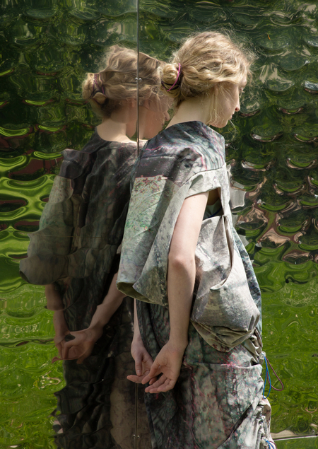 в проекте данный приём переносится на язык костюма. ключевая идея коллекции — отход от конвенциональных способов создания одежды с привычными лекальными элементами и деталями кроя, подстраивающимися под физиологию тела. избавление от привычного восприятия одежды и поиск нестандартных решений.