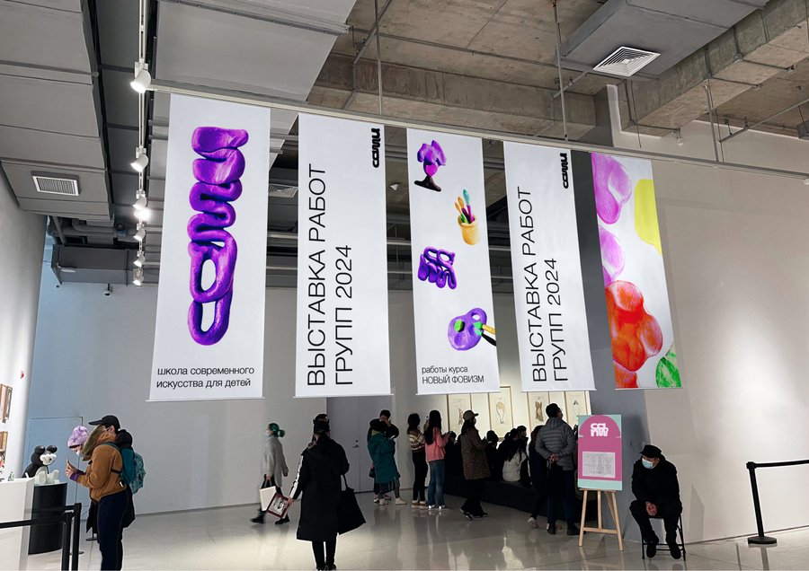 Promt: A medium shot, indoor photograph of a contemporary art exhibition space, featuring a series of four hanging banners and a group of people viewing the displayed art. The banners are suspended from the ceiling and hang vertically. Each banner is white, with different abstract and colorful graphics and text, with text in Cyrillic. The first banner displays a long, vertically-oriented abstract shape in purple, the second and third display different abstract shapes and a rendering of art supplies, also in purple and yellow. The fourth banner features colorful, abstract shapes resembling watercolor paint splotches in pink, orange, yellow and green. The banners also feature text that appears to be related to the name of the exhibition.