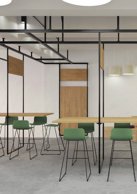 В темный угол помещения было решено поставить амфитеатр с выдвижными ящиками. Над ним установлены бумажные цилиндрические светильники, поддерживающие форму пуфиков. На визуализациях столы представлены в двух положениях: сложенном и разложенном. Часть мобильных столешниц убрана на специальный паркинг. С обратной стороны столешницы покрыты маркерной краской.
