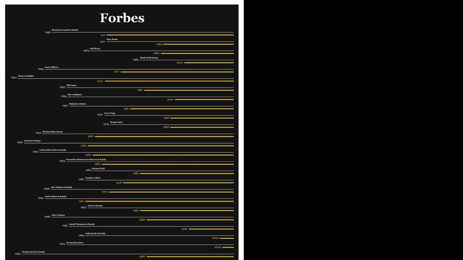 Никогда не поздно стать миллиардером. В этом можно убедиться, посмотрев на самых богатых людей в мире. В проекте представлена информация о миллиардерах Forbes за 2024 год. Для визуализации данных была использована программа Nodebox.