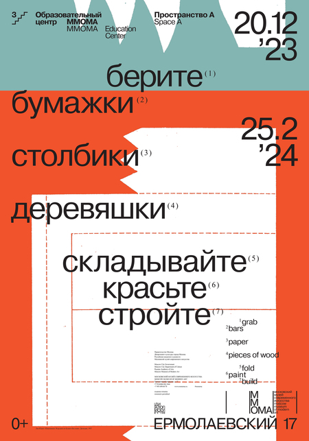 выставка, ориентирующаяся на активную педагогику, представляет возможность активного участия всем зрителям- возможность заняться «вырезалками», конструктивными бумажными проектами, где используются выкройки художников авангарда, создать свою книгу, зин, используя авангардистские деревянные литеры, разработанные Кристиной Скворцовой по шрифтам Александра Родченко, Эля Лисицкого, Алексея Гана, создать свой вариант разворота книги Ники Дубровской, предалагающей разные проекты города, составить макет здания по проекту архитекторов авангарда, используя конструктор Кристины Сковрцовой.