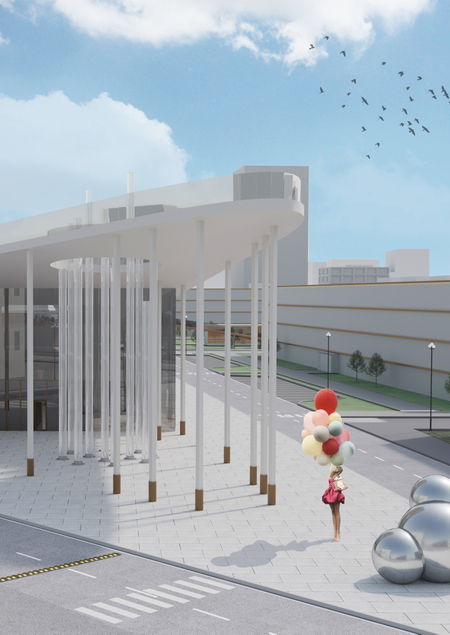 Центральным объектом площади, завершающим общий ансамбль, является здание многофункционального культурного центра Менделеев