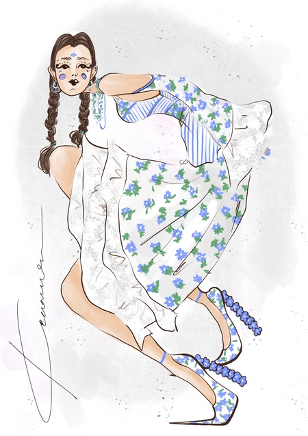 Легкий сарафан с интерпретированной душегрейкой (короткий топ, чуть ниже талии, на лямках. Спереди душегрея застегивается на пуговицы). Рукава приспущены вниз на резинке и составляют единое целое с сарафаном. Аксессуары и обувь дополняют образ.