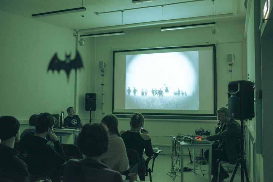 Показ фильма проходил с живым музыкальным сопровождением Сергея Летова (саксофон, бас-кларнет, электронные духовые) и Евгения Вороновского (скрипка, электроника).