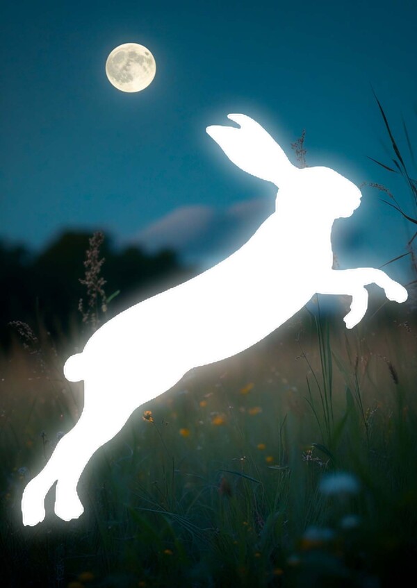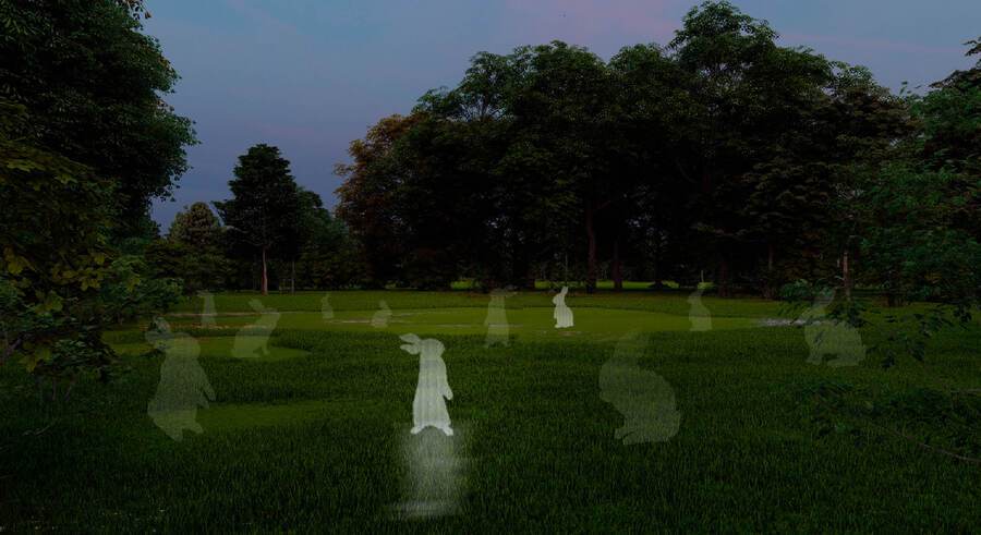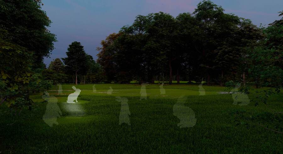 Фигурки расставлены по полянке с травой, в тени деревьев. В разное время загорается только один или два кролика, создавая ощущение движения или «бега». Это визуальная игра, в которой зритель наблюдает или участвует, бегая между мигающими кроликами — как будто сам становится частью детской сказки.