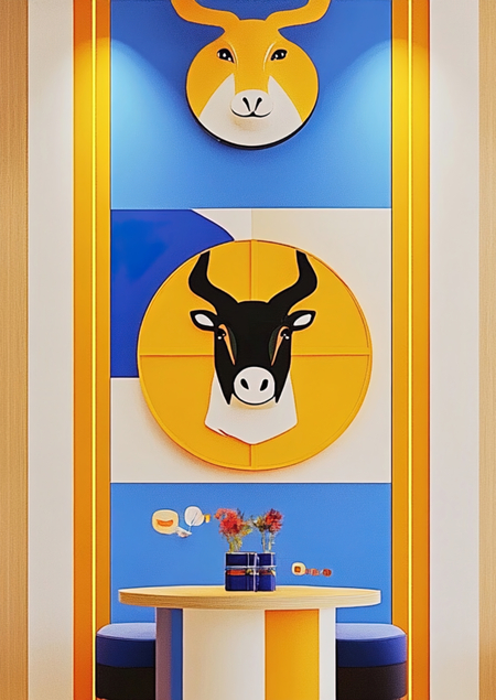 Design a playful and immersive retail space for the DIY bubble tea brand ’Chabbl.’ The venue features vibrant signage and a geometric, modern aesthetic with the brand’s colors: orange, blue, yellow, and pink. The layout includes an interactive DIY bubble tea station, a cozy seating area, and a display for pre-packaged kits. The space incorporates the Chinese zodiac theme with wall art or sculptures of each animal, paired with their bubble tea stories. Bubble tea motifs like tapioca pearls and swirling tea patterns appear subtly in decor. Warm, dynamic lighting highlights key zones, creating an inviting and Instagram-worthy atmosphere. Digital screens showcase the zodiac posters, adding storytelling elements. The design encourages exploration and creativity, making ’Chabbl’ a fun destination for bubble tea enthusiasts to mix flavors and share their experiences.