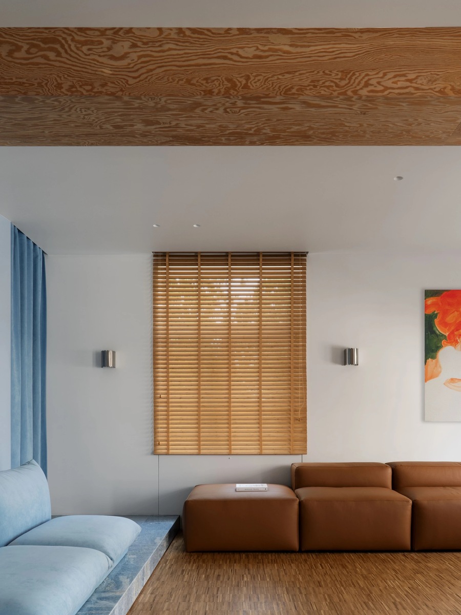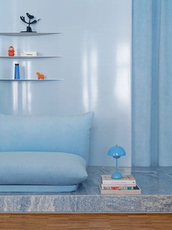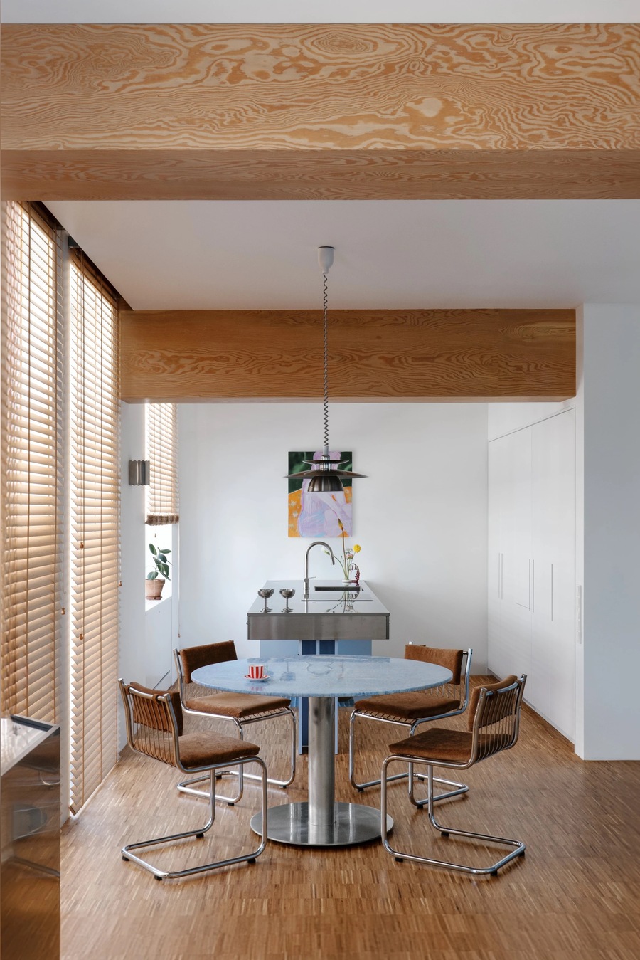 The apartment in a historic building in the center of Moscow, Russia, has become an experimental site for the design bureau «.dpt». The client wanted to rethink the interior of the apartment. The concept of the project is based on a combination of rhythmic straight lines, circles and waves. This approach refers to the work of the De Stijl group, which worked in Europe in the 1930s: the artists used an abstract composition as the basis of an architectural object and worked with a single form and color blocks. The apartment was divided into two parts: an area of a combined living and dining rooms and kitchen, and private spaces — an office and a bedroom with a dressing room and a bathroom. The core of the interior was a sky-blue design in the center of the first part. The bright orange color creates the necessary dynamics. Such details as a table lamp or a sink bring back to the 1970s.