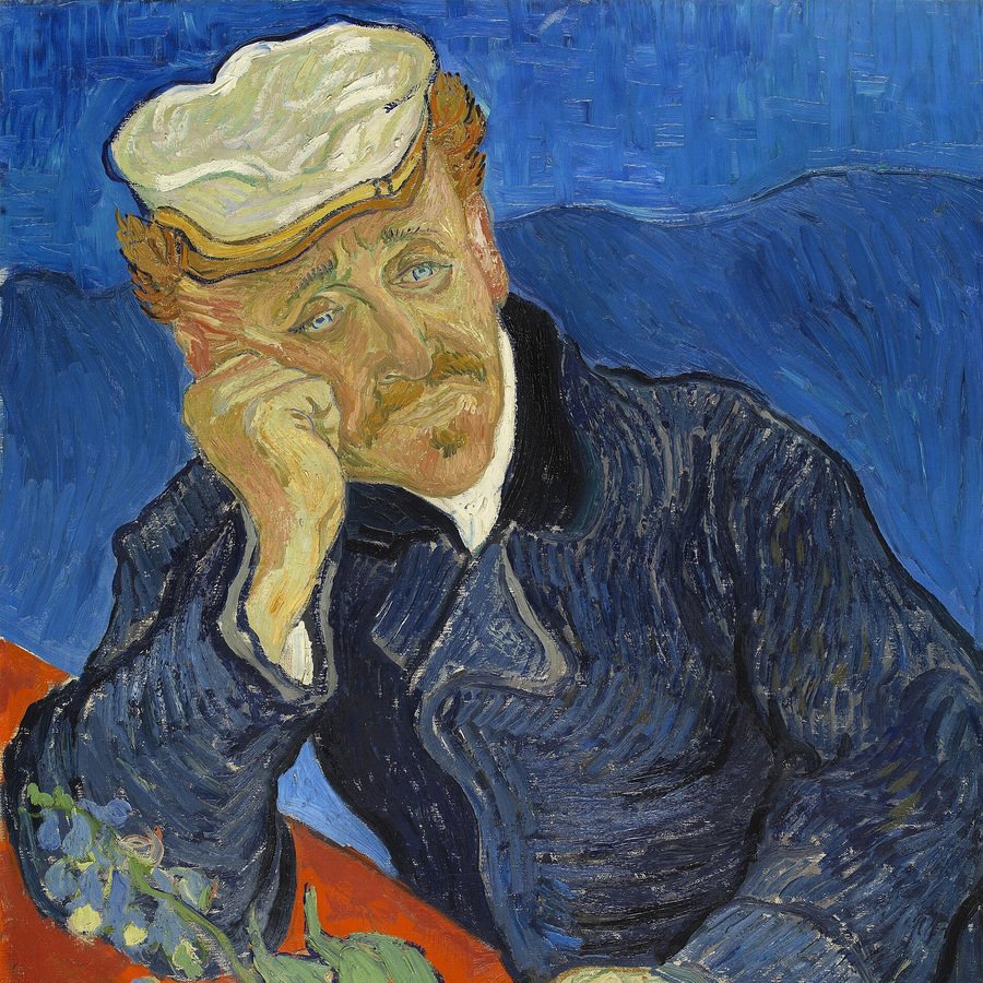 Для начала я решила сгенерировать изображение самого художника, и получилось очень похоже на его оригинальные автопортреты. Этот мужчина похож на самого Ван Гога, фон характерен для этого художника. Промт: «photo collage in VANGOG style, portrait of a man with a red beard and blue eyes in a Russian ushanka hat»