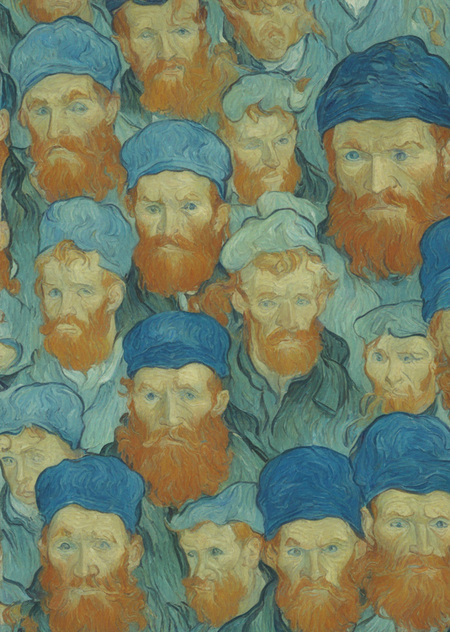 Все эти мужчины очень похожи на автопортреты Ван Гога. Промт: «photo collage in VANGOG style, a man with a red beard and blue eyes in a Russian ushanka hat»