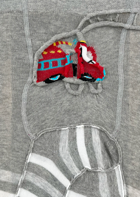 В этой графической серии с помощью складок, напоминающих гармошки на коленках детей, я переношу свои детские рисунки на колготки с картинками