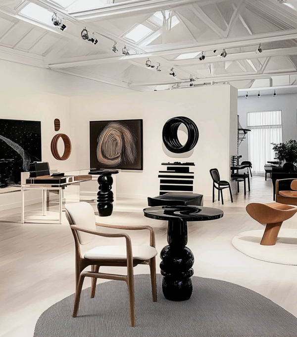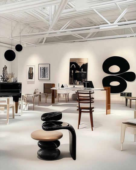 Create a modern furniture marketplace in a contemporary minimalist style with Bauhaus elements. The space features a light color palette with accents of black and warm beige tones. The visualization includes stylish designer furniture pieces such as chairs with smooth sculptural lines, natural wood tables, and modern accent armchairs. Geometric and abstract art objects appear on the walls and decor, emphasizing an aesthetic approach and connection to Bauhaus. The setting is an industrial space with high ceilings, white beams, and loft elements such as exposed wiring and metal structures. The furniture should appear modern, unique, and refined, with glossy surfaces, soft upholstery, and materials like chrome, black metal, wood, and textiles --ar 4:5 --v 6.0