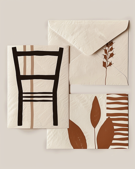 Конверт: High quality mockup of a postcard and envelope set designed in a modern bohemian and tribal inspired aesthetic. The postcard features abstract geometric patterns, hand drawn tribal motifs, and bold brushstroke illustrations. The envelope complements the design with minimalist geometric accents and subtle handcrafted details. The color palette includes soft taupe (#A69281), deep brown (#402617), warm terracotta (##57402C), clean off white (#F2F2F2), and bold black (#0D0D0D), creating a harmonious and earthy visual. The materials have a textured, matte paper finish to emphasize the artisanal style. The composition is clean, set against a neutral white background with soft, natural lighting and delicate shadows to enhance the sense of quality and craftsmanship. Ideal for showcasing modern, artistic stationery with a touch of elegance and individuality. --ar 4:5 --v 6.0