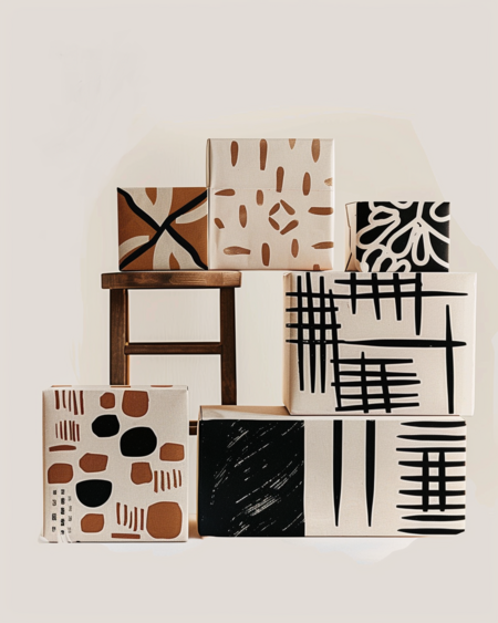 Коробки: High quality mockup of a set of gift boxes in various sizes, designed in a modern bohemian and tribal inspired aesthetic. The boxes feature abstract geometric patterns, hand drawn tribal motifs, and bold brushstroke illustrations. Each box uses a cohesive and earthy color palette: soft taupe (#A69281), deep brown (#402617), warm terracotta (#57402C), clean off white (#F2F2F2), and bold black (#0D0D0D). The designs are printed on matte textured surfaces, giving a handcrafted, artisanal look. The composition is clean and minimalistic, set against a neutral white background in an axonometric visualization style with soft, natural lighting and subtle shadows. The overall appearance is elegant, artistic, and refined, perfect for showcasing premium packaging for modern, creative gifting. --ar 4:5 --v 6.0