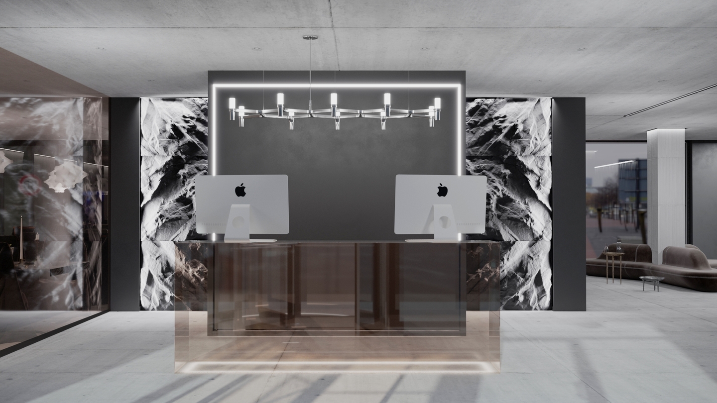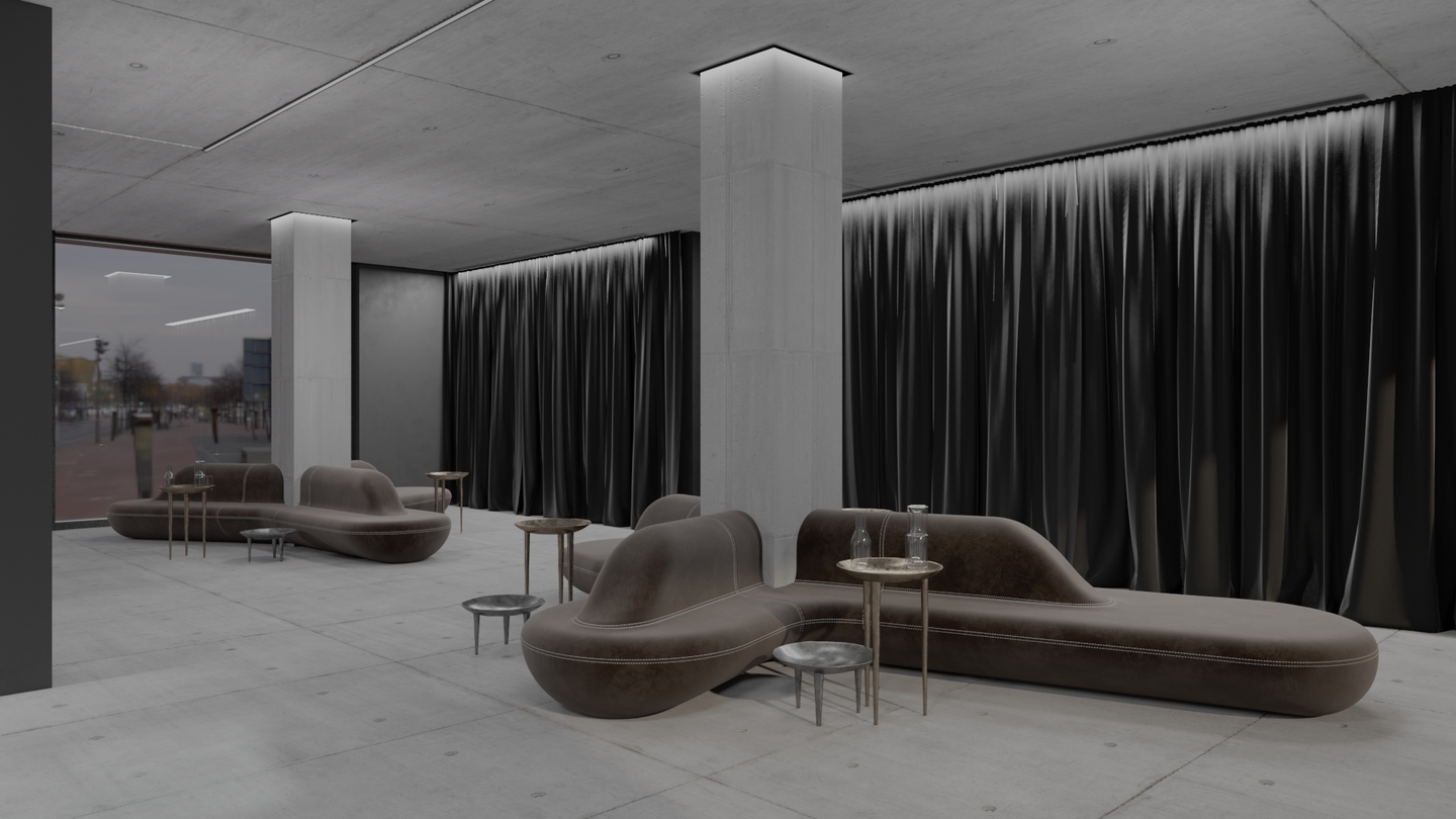 Проект интерьера отеля, дизайн пространства был вдохновлен дизайнерской одеждой и тенденциями современной моды. В основном используется бетон, камень, черная штукатурка, черные ткани для штор и стульев, а так же акцентные темно-бежевые цвета.