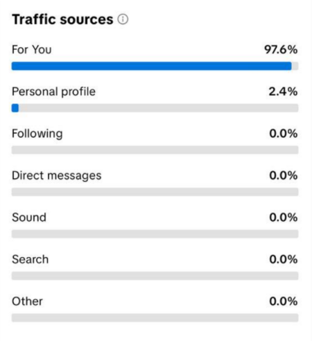 Источники трафика показывают, что 97% просмотров приходят из ленты рекомендаций, здесь chat gpt справился с подбором хэштегов.