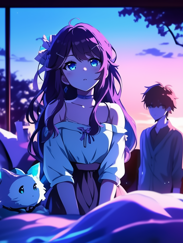 Prompt: (референс) Cute anime girl at dawn, she looks thoughtful. The whole picture is in light blue, purple, mauve and pink tones. Prompt: (обложка) The cover for a project related to the analysis of the anime industry, the picture must contain anime characters