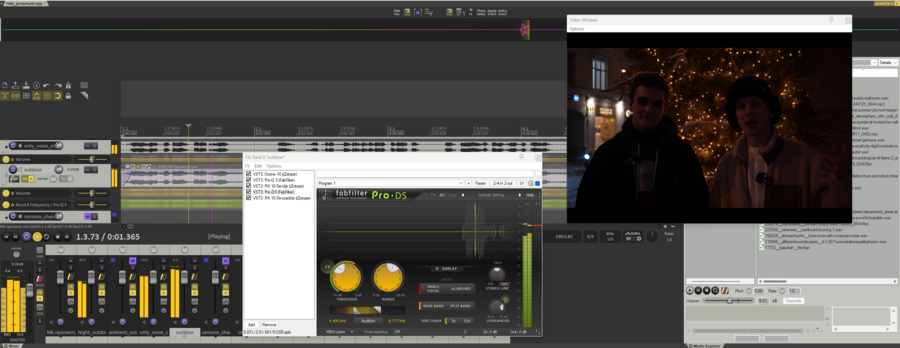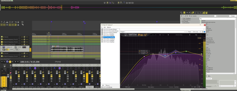 В основном, плагины использовались для убирания шумов/точечного регулирования громкости и очистки речи. Эквалайзеры, ревербераторы и все RX 10 плагины. Плюс, деэссер от fabfilter
