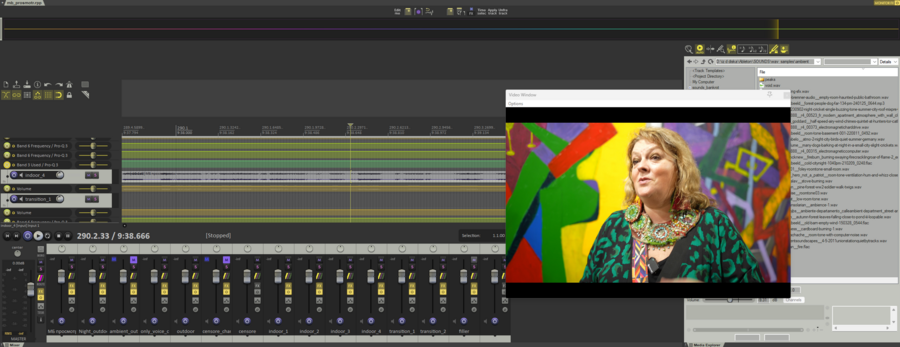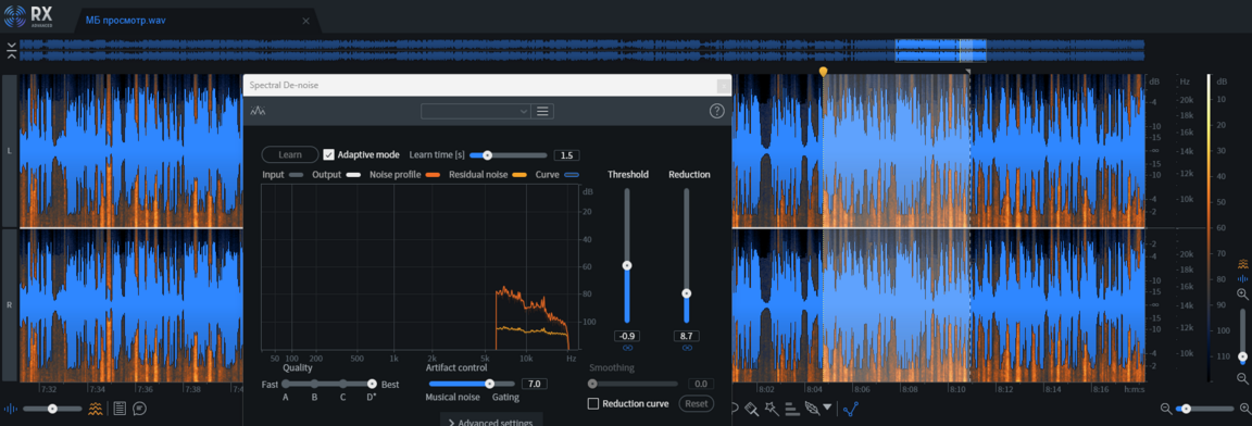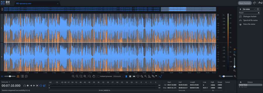 Основным затыком стала изначальная запись голоса. Особенно это заметно на улице, когда голоса съедаются посторонними шумами. Решением стало отделение голоса от остальной голосовой дорожки в RX Pro Audio Editor (с помощью внутренних инструментов. таких, как Spectral De-noise и Dialogue Isolate). Далее отделенная звуковая дорожка голоса смешивалась с записанными отдельно румтонами (звуки улицы). Получилась некая смесь звуков с подложкой и звуков обработанных.