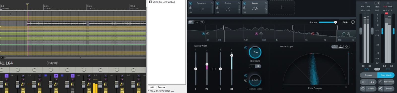 Также, навешенный на мастер трек Youlean Loudness Meter 2 в режиме реального времени постоянно мониторил изменения в громкости. Для наполненности по частотам использовался встроенный в Ozone 10 плагин Imager.