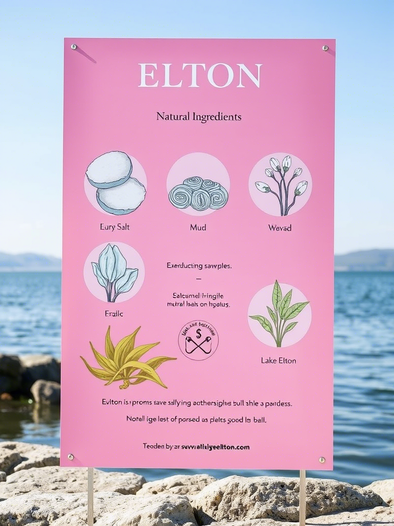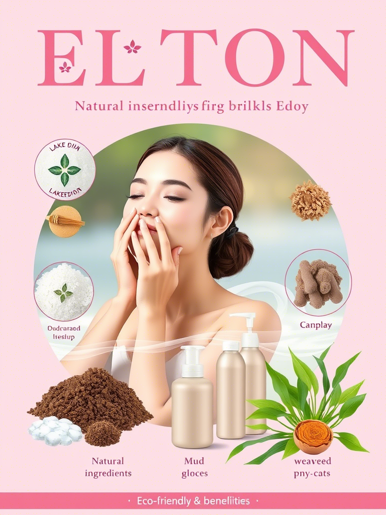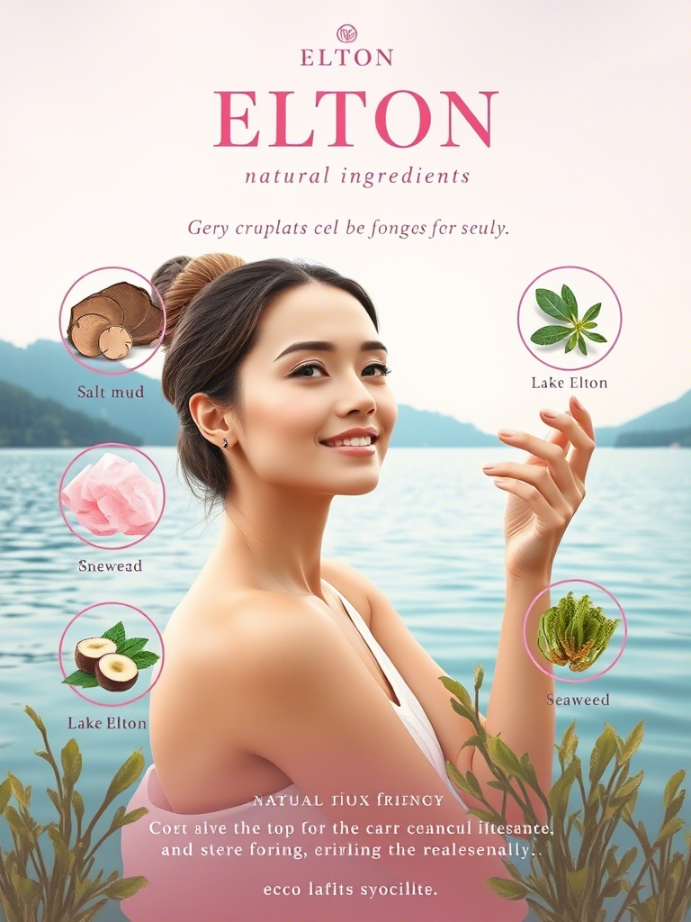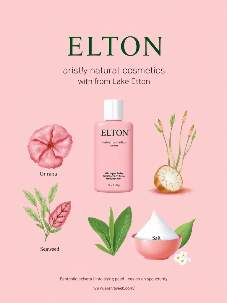Create posters and flyers for ELTON natural cosmetics, featuring the brand’s primary color is pink. Highlight the unique ingredients from Lake Elton and emphasize the eco-friendly and sustainable aspects of the products. Incorporate a visually striking element where the ELTON products appear to be reflected in the serene waters of Lake Elton, symbolizing harmony with nature. Please provide eye-catching visuals with clear typography.