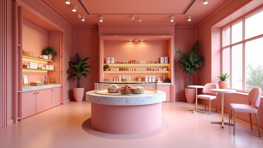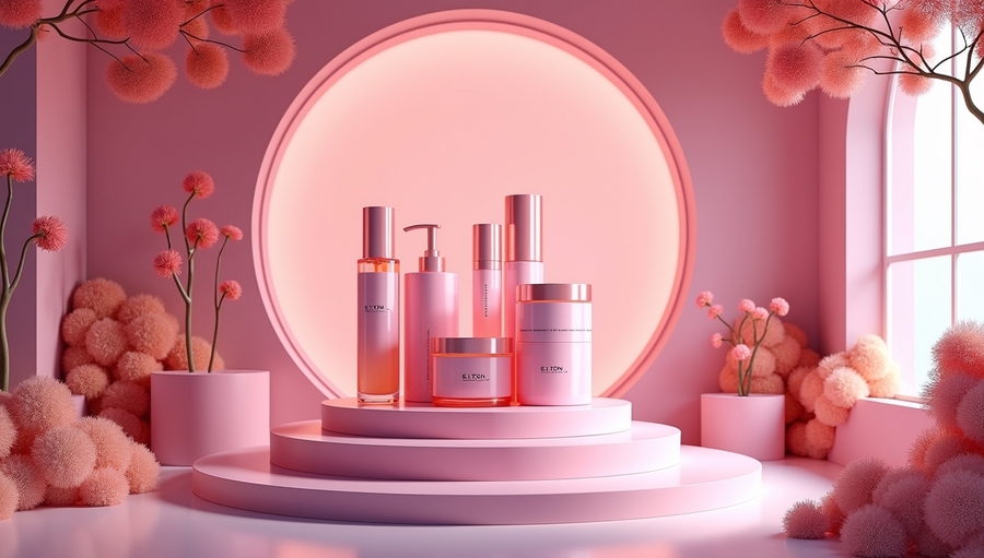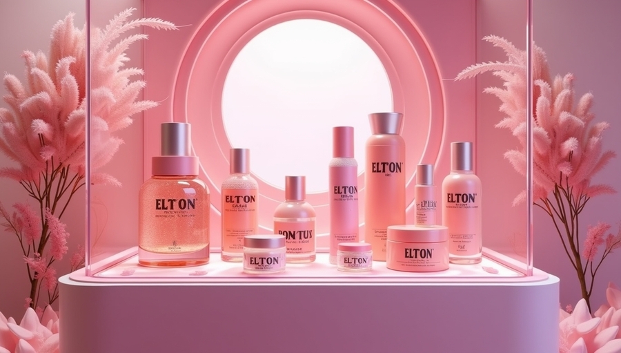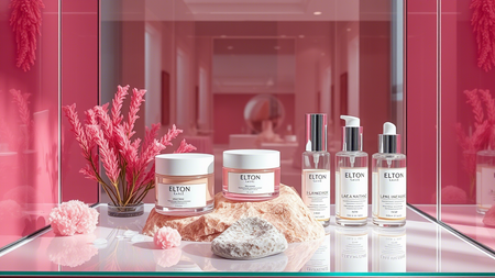 Create a close-up of the glass showcase for ELTON, incorporating the brand’s primary color is pink into the design. The showcase should reflect the natural beauty of Lake Elton and highlight the unique ingredients of the products. Please provide a detailed 3D visualization of the showcase.