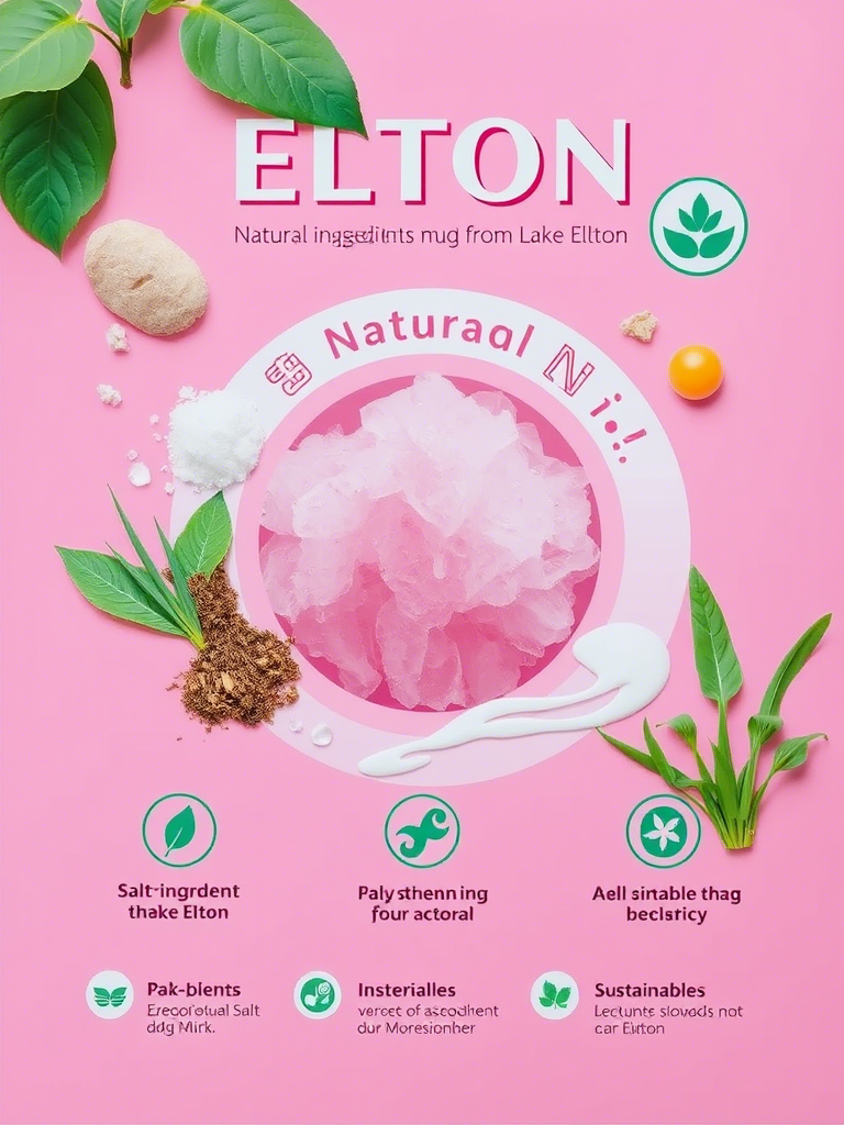 Create posters and flyers for ELTON natural cosmetics, featuring the brand’s primary color is pink. Highlight the unique ingredients from Lake Elton and emphasize the eco-friendly and sustainable aspects of the products. Please provide eye-catching visuals with clear typography.