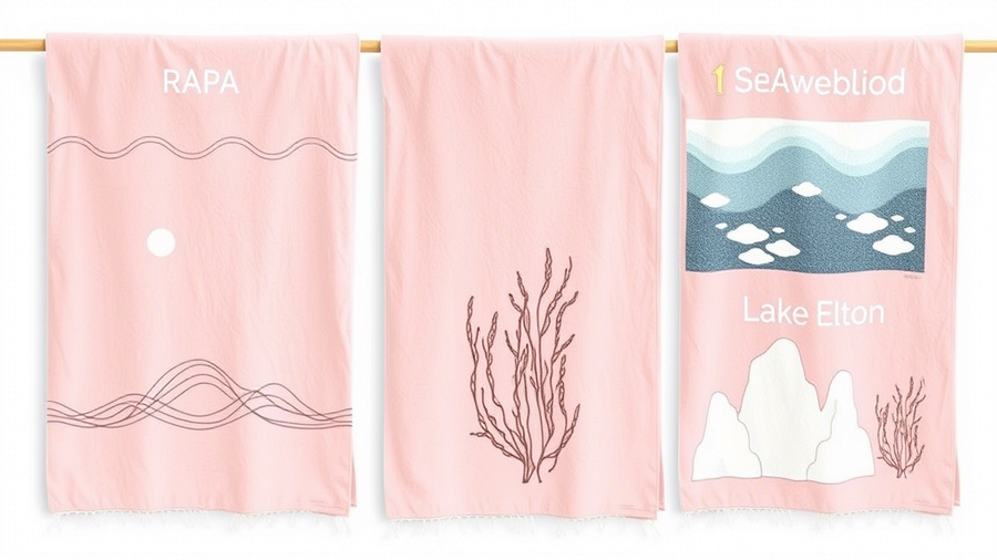 Design a set of towels for the ELTON brand, incorporating the primary color pink. The towels should feature a subtle pattern or design element that reflects the natural beauty of Lake Elton, such as a minimalist wave motif or a stylized illustration of rapa or seaweed. Ensure the design is soft, calming, and eco-friendly in appearance, aligning with the brand’s sustainable ethos. Please provide a range of design options with varying levels of detail.