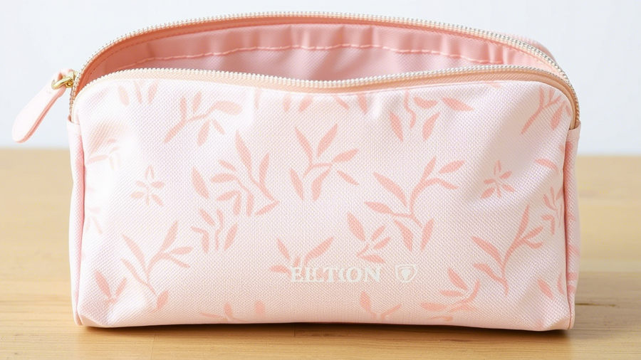 Design a cosmetic bag for the ELTON brand, incorporating the primary color pink. The bag should feature a design element that reflects the natural beauty of Lake Elton, such as a stylized pattern of rapa or seaweed. Ensure the material is eco-friendly and durable, aligning with the brand’s sustainable ethos. The bag should be functional, with multiple compartments for organizing cosmetics, and include a clear ELTON logo. Please provide design options with varying levels of detail and texture.