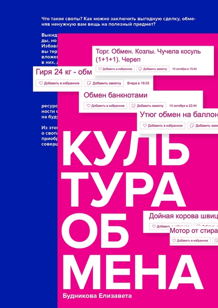 Книга «Культура обмена» рассказывает о различных проявлениях разумного потребления сегодня, а также рассматривает явление свопа в современной культуре.