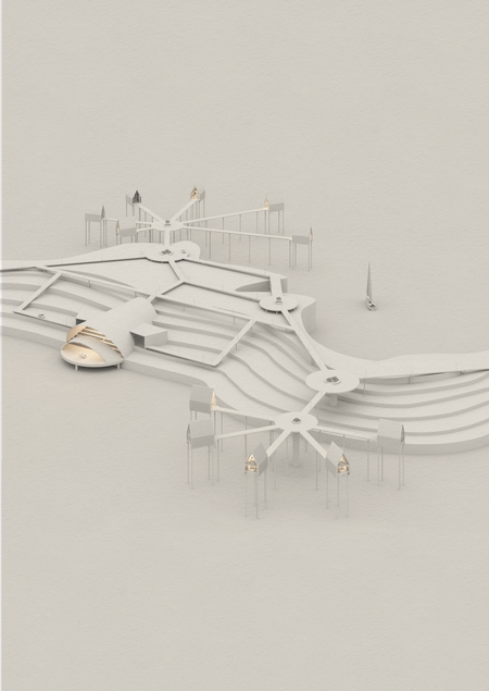 Система дорожек ведет как к концертному холлу, так и к трем группам свайных домов. Каждая группа находится на разных высотных уровнях: 15 метров, 10 и 5 соответственно