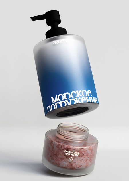 The line «sea dive» is a simulation of the sea and seabed. The package consists of two parts: the upper part, the foam that reflects the sea, and the lower part, the sea salt, the shimmer, and the grass for the bath, which represent the bottom of the sea.