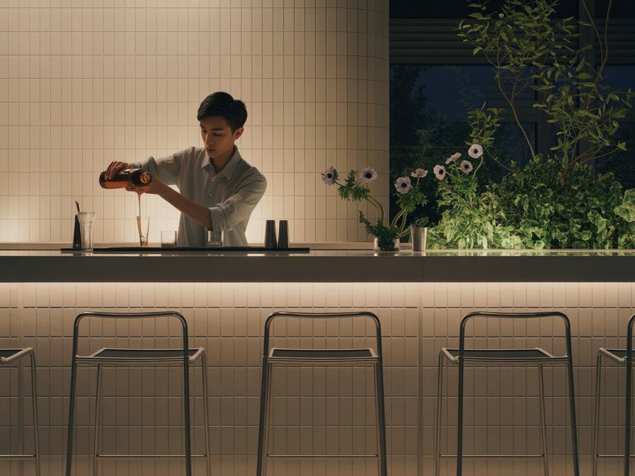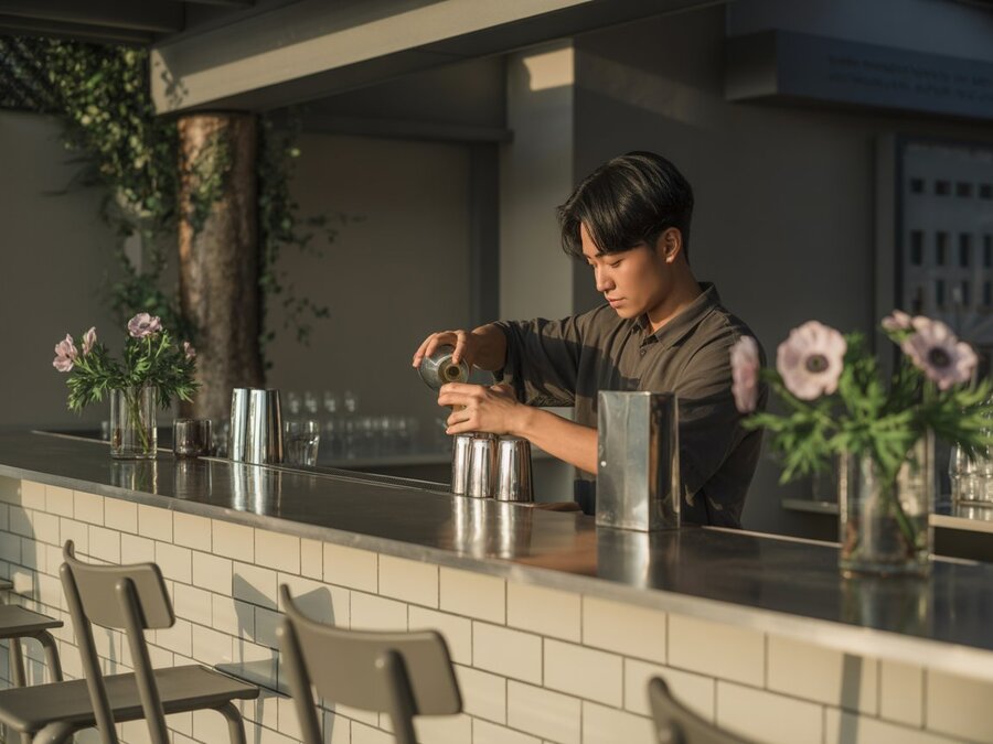 promt — modern interior of the bar counter with a young man of Asian appearance who pours drinks table with warm nignt natural light, minimalistic design, metal chairs, plants and flowers of anemonia, white tiles, soft shadows, inviting atmosphere, high-resolution photorealism