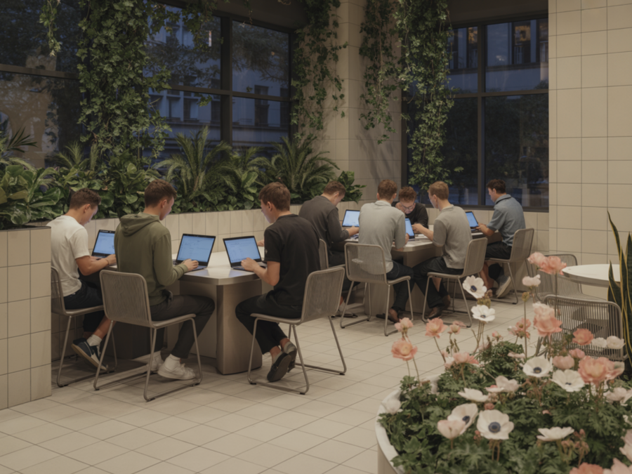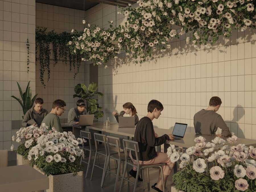 promt — modern interior of the coworker cafe area with night natural lighting, minimalistic design, metal chairs, plants and a lot of flowers of anemonia, cream tiles, soft shadows, inviting atmosphere, high-resolution photorealism. 17-18 Young boys and girls with laptops are sitting at the tables