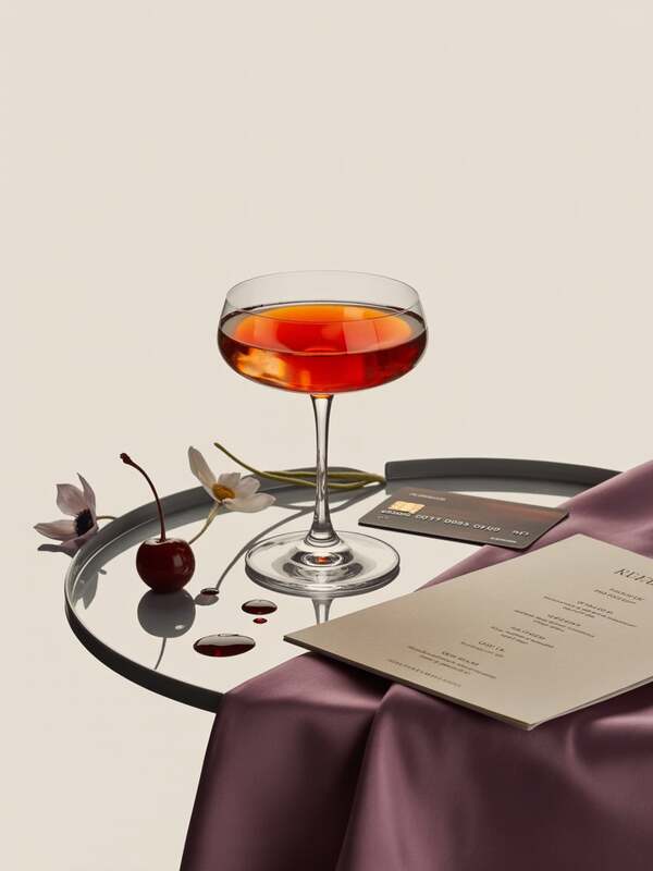 promt — a photo of a cocktail glass with bright red-orange liquid, highlights and reflections, minimalistic style, high detail, smooth surface, modern digital art, soft glowing edges, clean background. The glass stands on a metal tray with a cherry from a cocktail on it. There is a restaurant menu on a table with a purple tablecloth nearby. There are drops of wine, credit card and a couple of dried petals of a anemone flower on the tray.