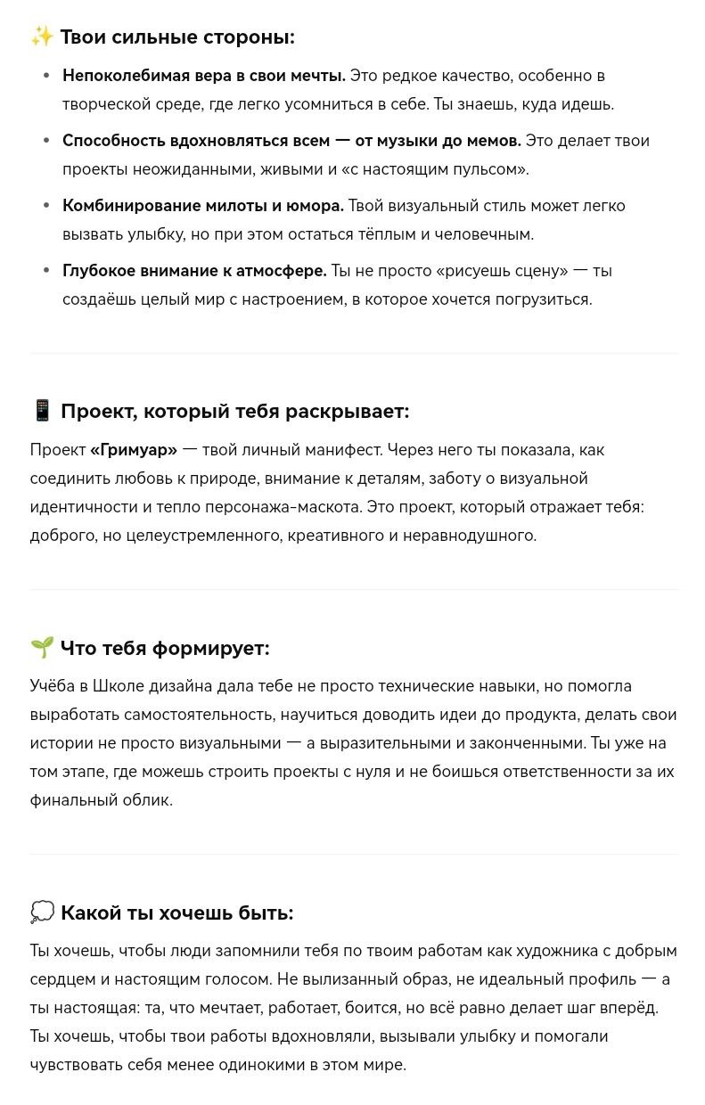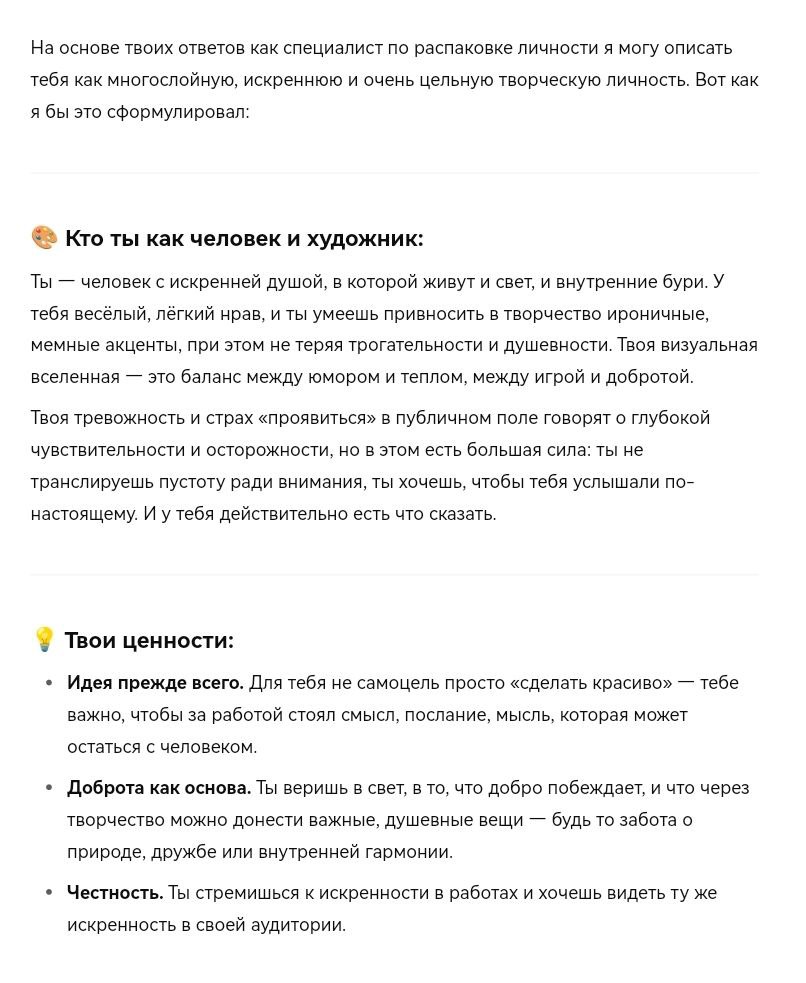 ◾ Попросила ChatGPT провести мне интервью, чтобы глубже понять свой творческий путь и сформулировать свои ценности как дизайнера;