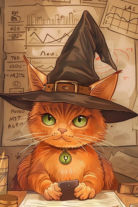 Промт для Midjourney: 2D illustration, cartoon style drawing, a cute red cat with green eyes wearing a witch’s black hat is studying SEO on his laptop, there are graphs and charts in the background.