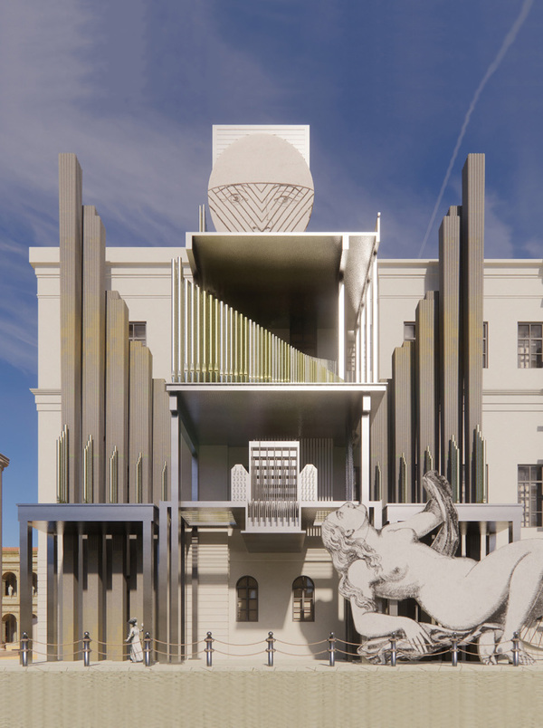 Временный фасад музея архитектуры им. Щусева создан к выставке работ Макса Эрнста «Пять граций». Стилистика фасада вдохновлена коллажами художника, на основе гравюр. Три фигуры фасада складываются в имя художника: MAX.