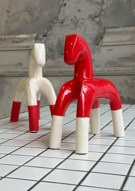В основе образ лошади как одного из ключевых и устойчивых символов русской народной культуры. Единая форма символизирует устойчивость культурного образа, а различие в цвете показывает, как одна и та же основа может по-разному восприниматься и интерпретироваться сегодня.